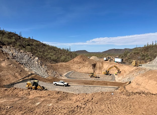 Construction continues to progress at Menager’s Dam on the Tohono O’odham Nation in Arizona, where we are providing construction engineering services for a new rockfill embankment dam. RJH began providing design services to the Bureau of Indian Affairs in 2020 to replace the existing dam and construct a new dam and outlet works,